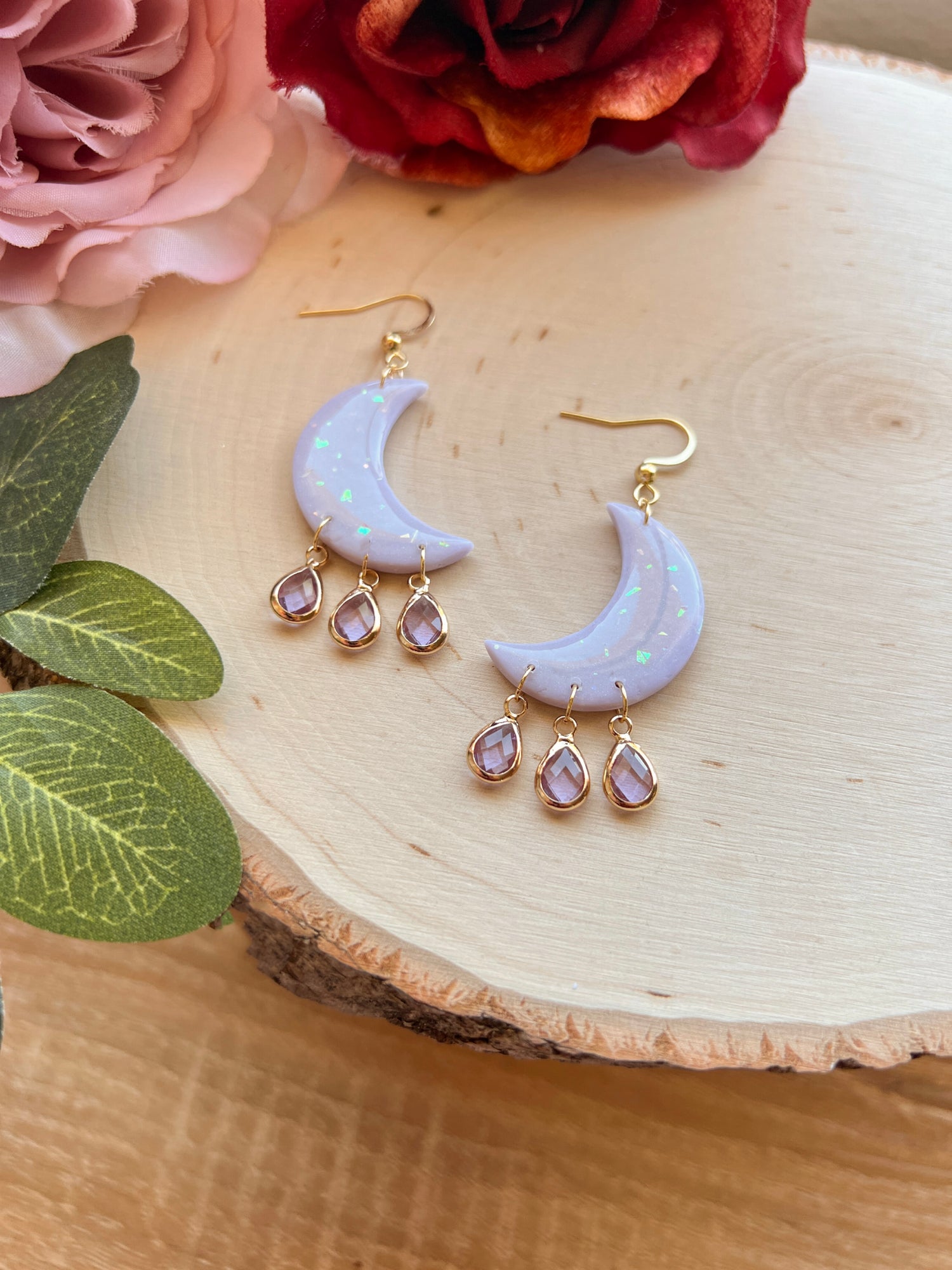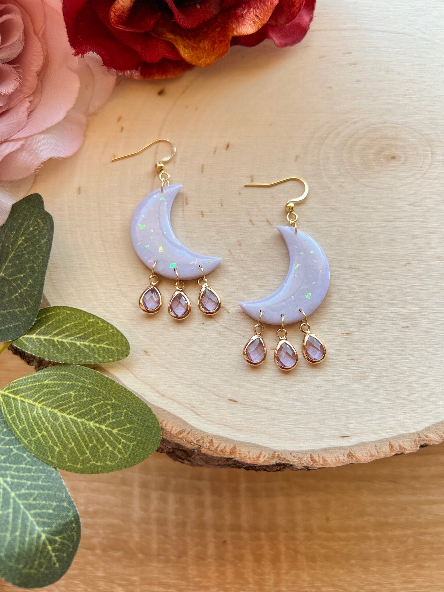 Handmade with polymer clay, these Lilac Moon earrings feature a dreamy blend of soft lilac tones and opal shimmer that catches the light with every movement. Delicate glass droplets dangle below the moons like sparkling stardust, adding a touch of magic to each pair. Lightweight and whimsical, they’re perfect for anyone who loves celestial jewelry with an artistic twist. Finished with hypoallergenic, gold-plated hooks and gold-filled jump rings, these earrings are both elegant and gentle on sensitive ears. A beautiful addition to any collection of handmade moon earrings or lilac opal polymer clay jewelry.