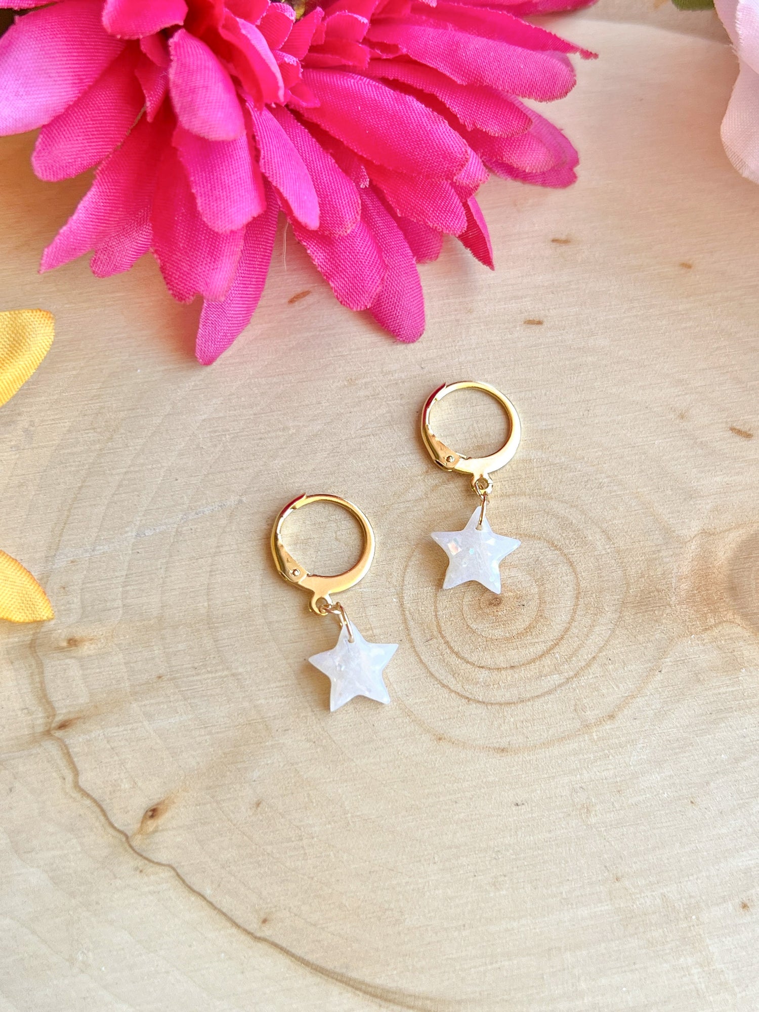 Handmade with polymer clay, these tiny opal star huggies are your new favorite everyday go-tos. Delicate, sparkly, and lightweight, they add the perfect touch of magic without ever feeling too loud. The dreamy opal shimmer catches the light just right, making them easy to dress up or down. A subtle celestial detail for anyone who loves stars, minimal jewelry, or that soft, whimsical glow.
