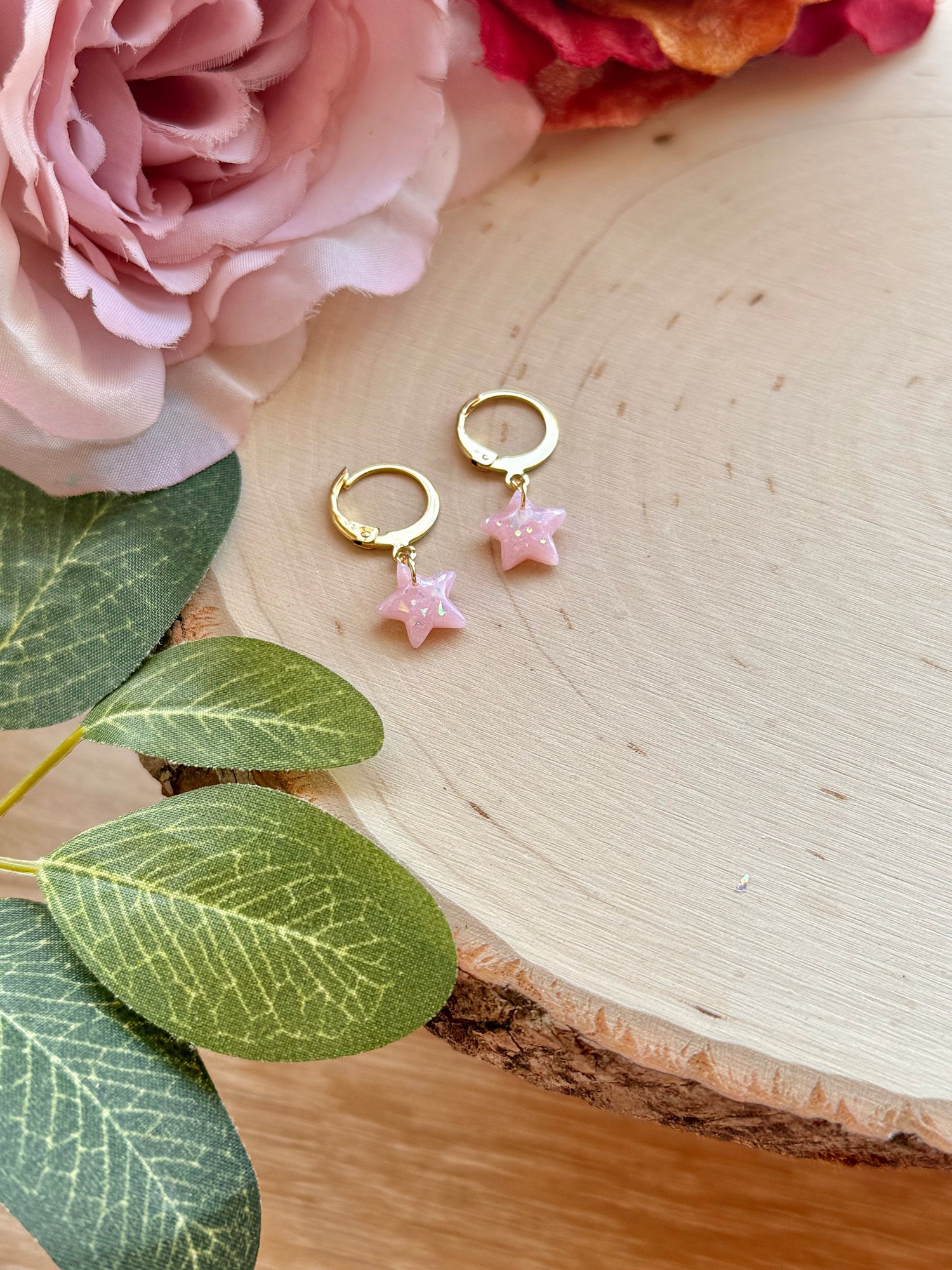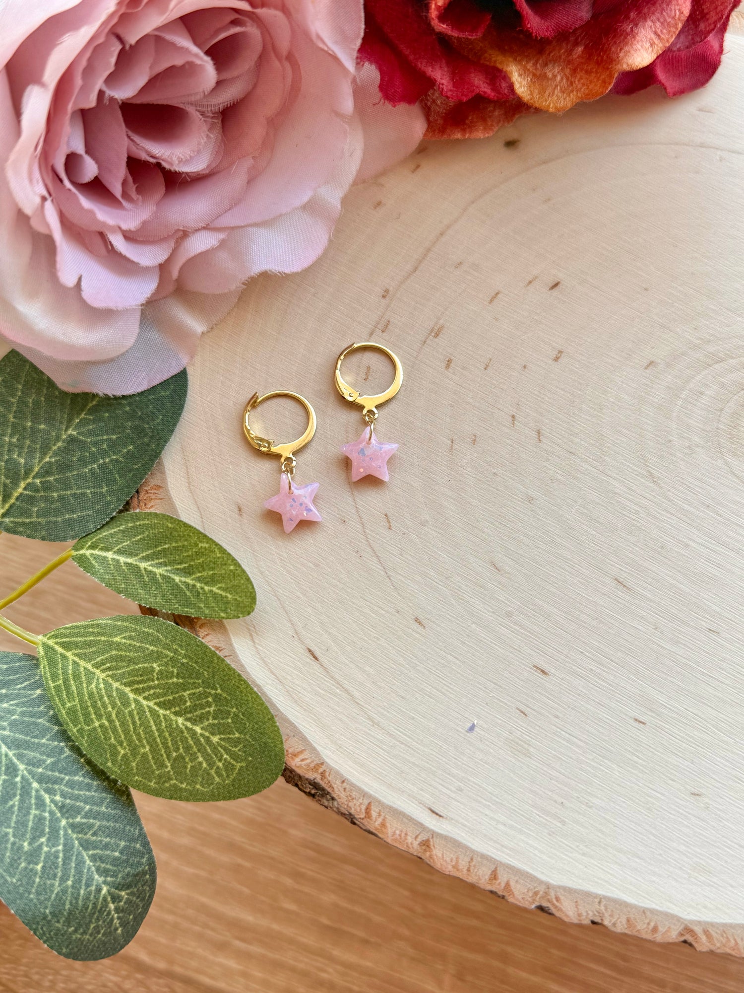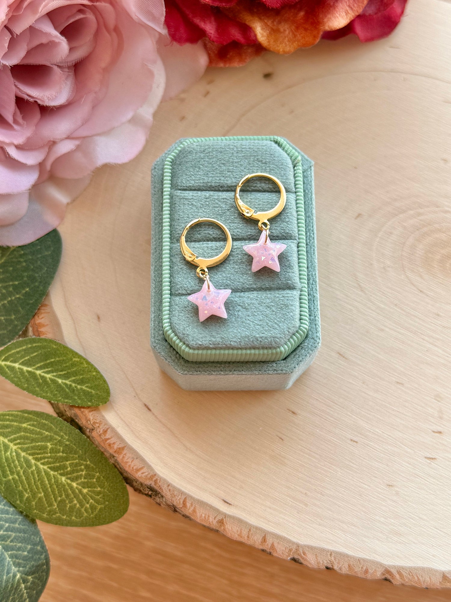 Handmade with polymer clay, these tiny opal star huggies are your new favorite everyday go-tos. Delicate, sparkly, and lightweight, they add the perfect touch of magic without ever feeling too loud. The dreamy opal shimmer catches the light just right, making them easy to dress up or down. A subtle celestial detail for anyone who loves stars, minimal jewelry, or that soft, whimsical glow.